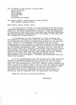 This two-page typed draft letter from Dennis Banks and John Thomas to "A Sense of the Sacred" Project Team was created circa 1988. The letter concerns a documentary project on the Indian grave desecrations in Union County, Kentucky. Banks and Thomas agree to work cooperatively and give priority access to the documentary crew for interviews and other events, but note that some rituals and individuals should not be photographed.