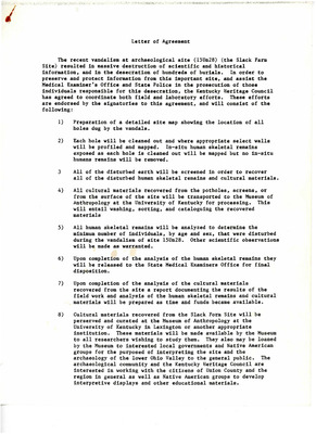 This two-page typed letter of agreement between the Kentucky Heritage Council, the State Medical Examiners Office, Oklahoma Shawnee representative, archeologists and the University of Kentucky outlines processes and procedures to be followed concerning the desecrated Indian graves at the Slack Farm site in Union County, Kentucky. Clauses within the agreement detail how the site will be documented and what will happen to recovered human remains and cultural materials.