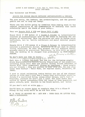 This copy of a one-page typed letter from Indian artifact collectors Kathy and Art Gerber was sent to fellow hobbyists circa February 1988. The letter urges friends to contact Kentucky state representatives in order to prevent passage of Senate Bill 178 and House Bill 493, which will classify excavation of archeological sites and prehistoric burial sites as Class D felonies.