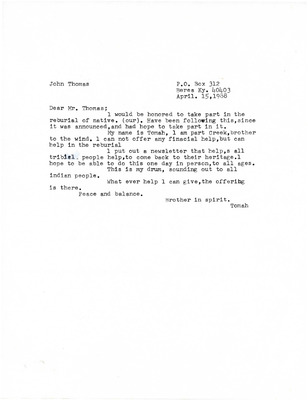 This single-page typed letter from Tomah to John Thomas was sent on April 15, 1988. Tomah states that he would like to participate in the Kentucky reburial efforts, offering whatever help he is able to provide. He also notes his involvement with a newsletter that helps tribal people reconnect with their heritage.