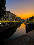 A large, bustling canal at sunset in Milan, Italy. The buildings along the sides of the Naviglio Grande are lit up against the background of a bright orange sunset, reflecting into the water of the canal.